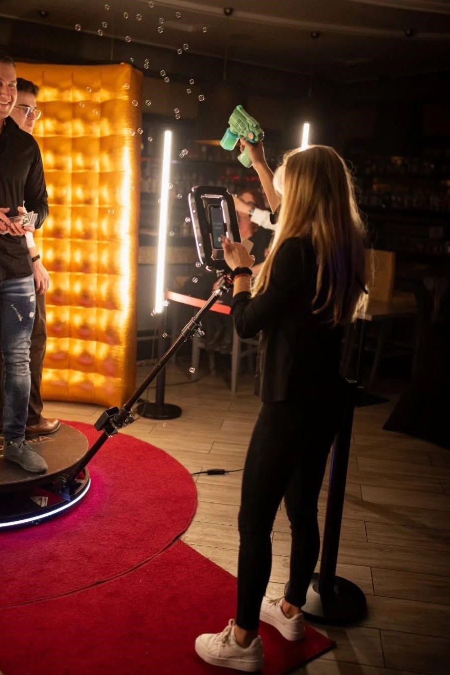 Asystent zaprasza kolejnych gości na platformę i instruuje jak się ustawić. Po odliczaniu obrotowe ramię wykonuje pełny obrót — trwa to około 20 sekund. Gotowy film trafia od razu na telefon gościa przez QR kod, e-mail lub AirDrop. Przed nagraniem goście mogą skorzystać z gadżetów, które są wliczone w pakiet.